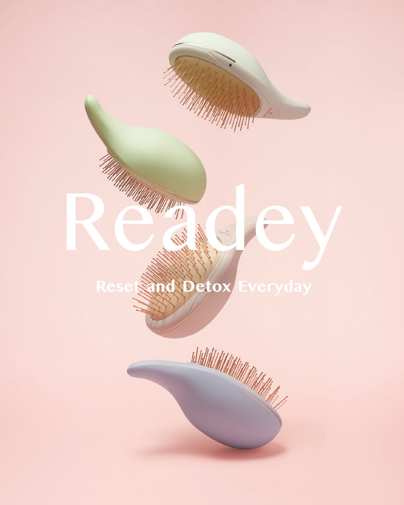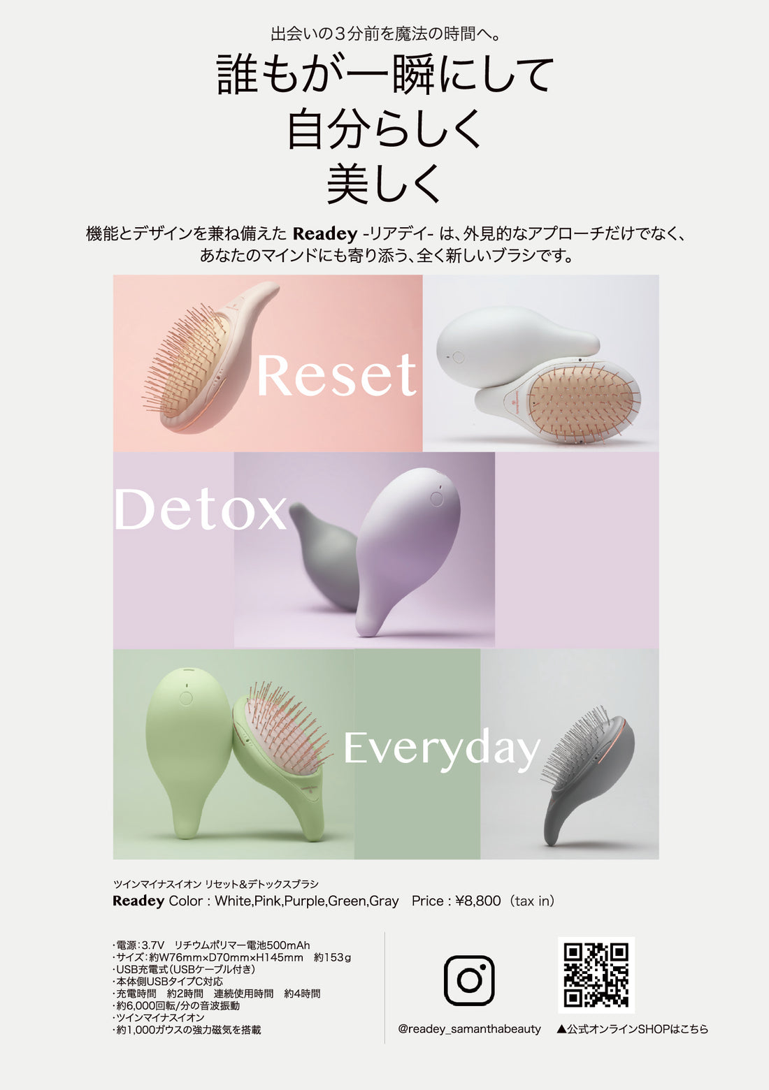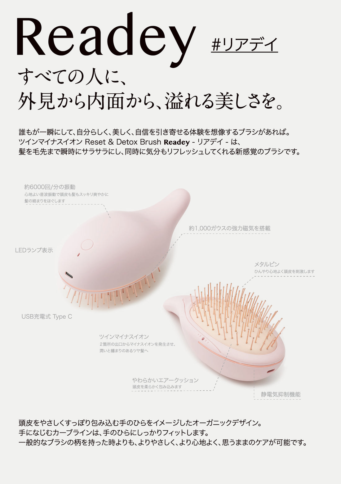 誰もが⼀瞬にして、⾃分らしく、美しく、⾃信を引き寄せる体験を創造できるブラシがあれば。ツインマイナスイオンReset & Detox Brush ”Readey-リアデイ-” は、 髪を⽑先まで瞬時にサラサラにし、同時に気分もリフレッシュしてくれる新感覚のブラシです。