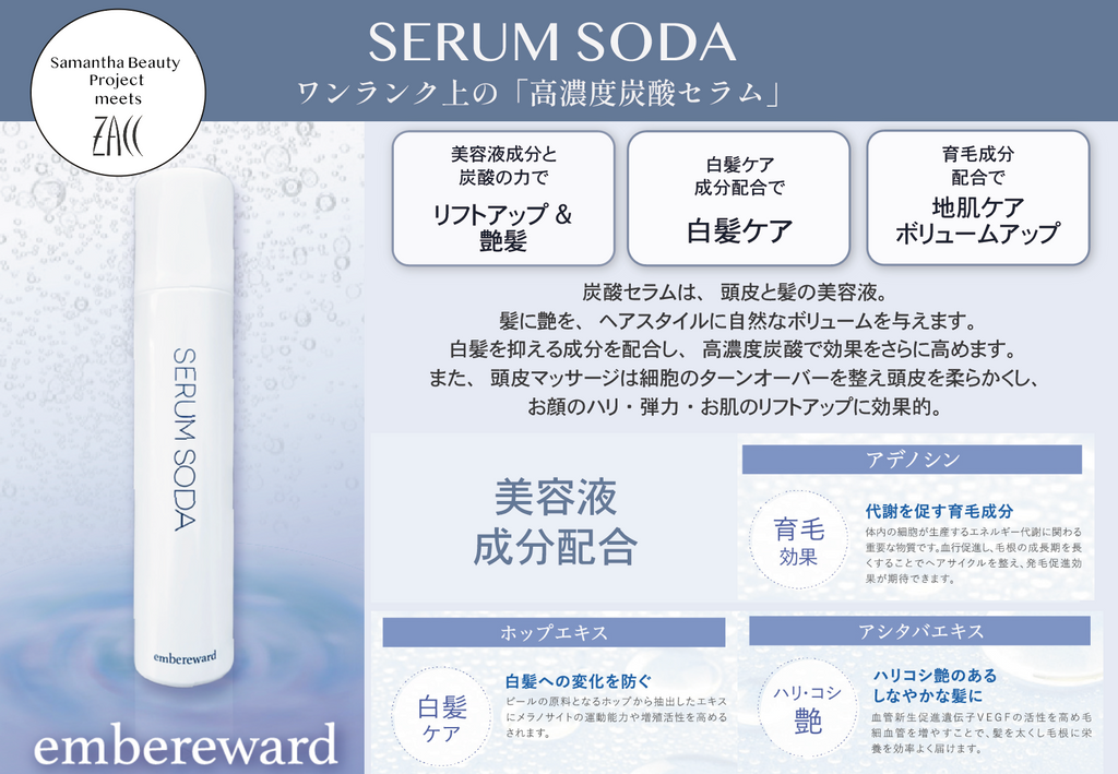 髪に艶を、ヘアスタイルに自然なボリュームを与えます。白髪を抑える成分を配合し、高濃度炭酸で効果をさらに高めます。